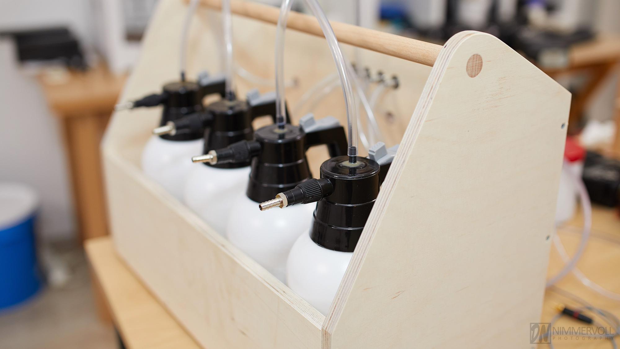 Mittlerweile biete ich Düsen in meinem Shop an, mit denen man bis zu 4 Ventile anschließen, und damit auch 4 unterschiedlich gefärbte Flüssigkeiten verwenden kann. Da dies doch schon recht aufwändig ist, habe ich daher nach einer Lösung gesucht die relativ einfach, komfortabel und kompakt ist.