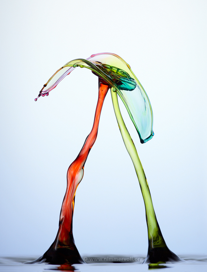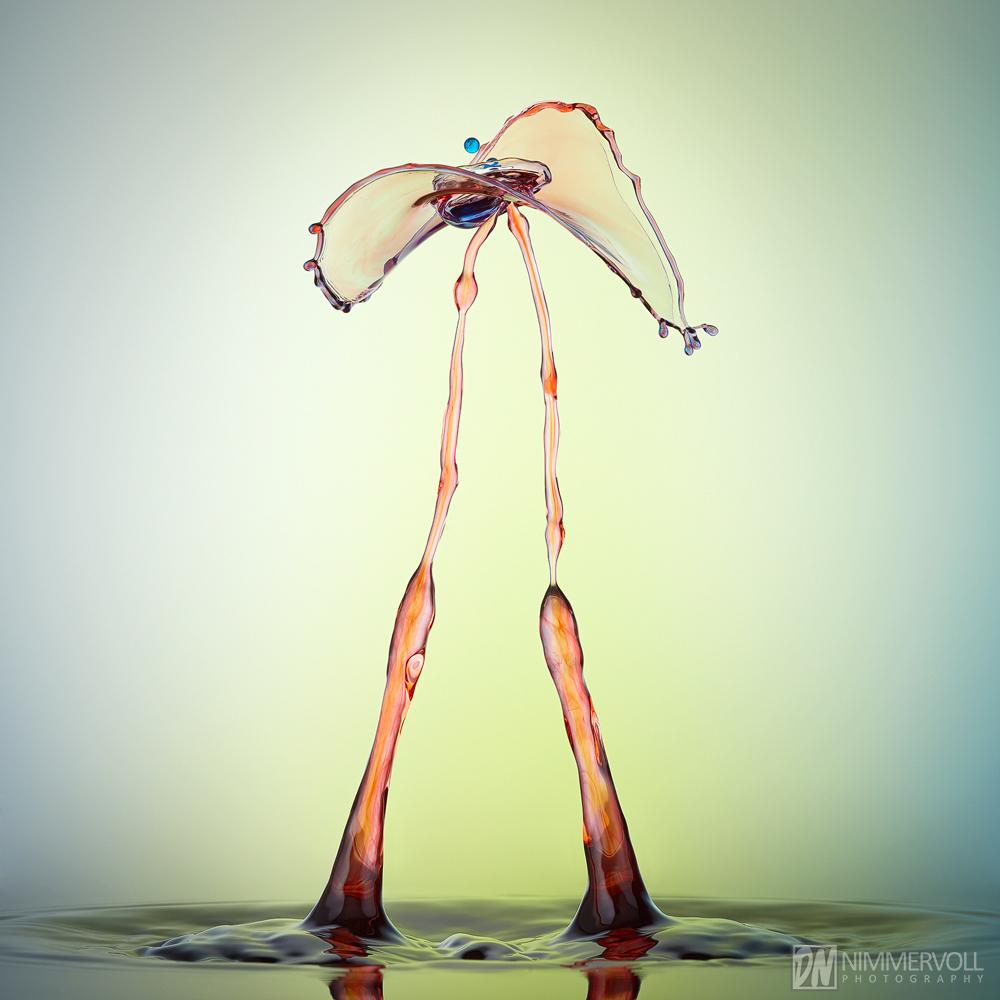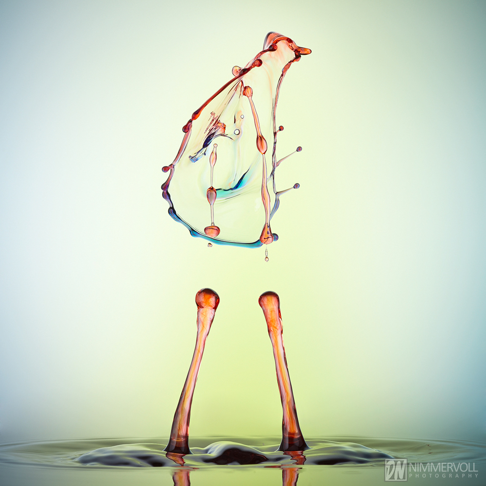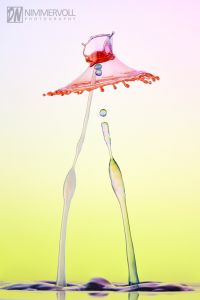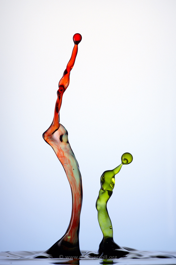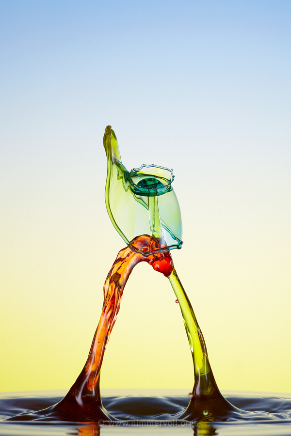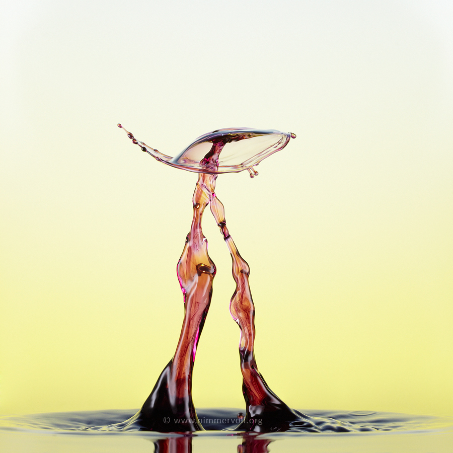 Übersetzt heißt das Doppelsäule. Es handelt sich also bei dieser Tropfenvariation um die sogenannten „Zweifüßer“. Diese Formen entstehen indem zwei Tropfen neben einander auf das Wasser auftreffen. Die dabei entstehenden Säulen ziehen sich gegenseitig an und treffen sich am höchsten Punkt um sich zu einer Säule zu verbinden. Mit etwas Glück, kann man dann auf diese Säule noch einen weiteren Tropfen landen um ein Schirmchen zu erzeugen.