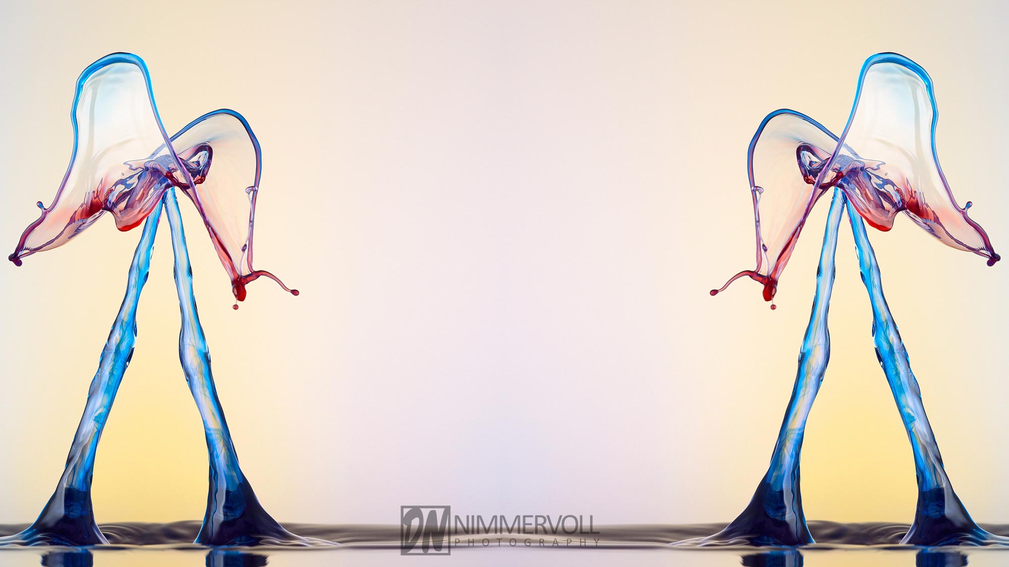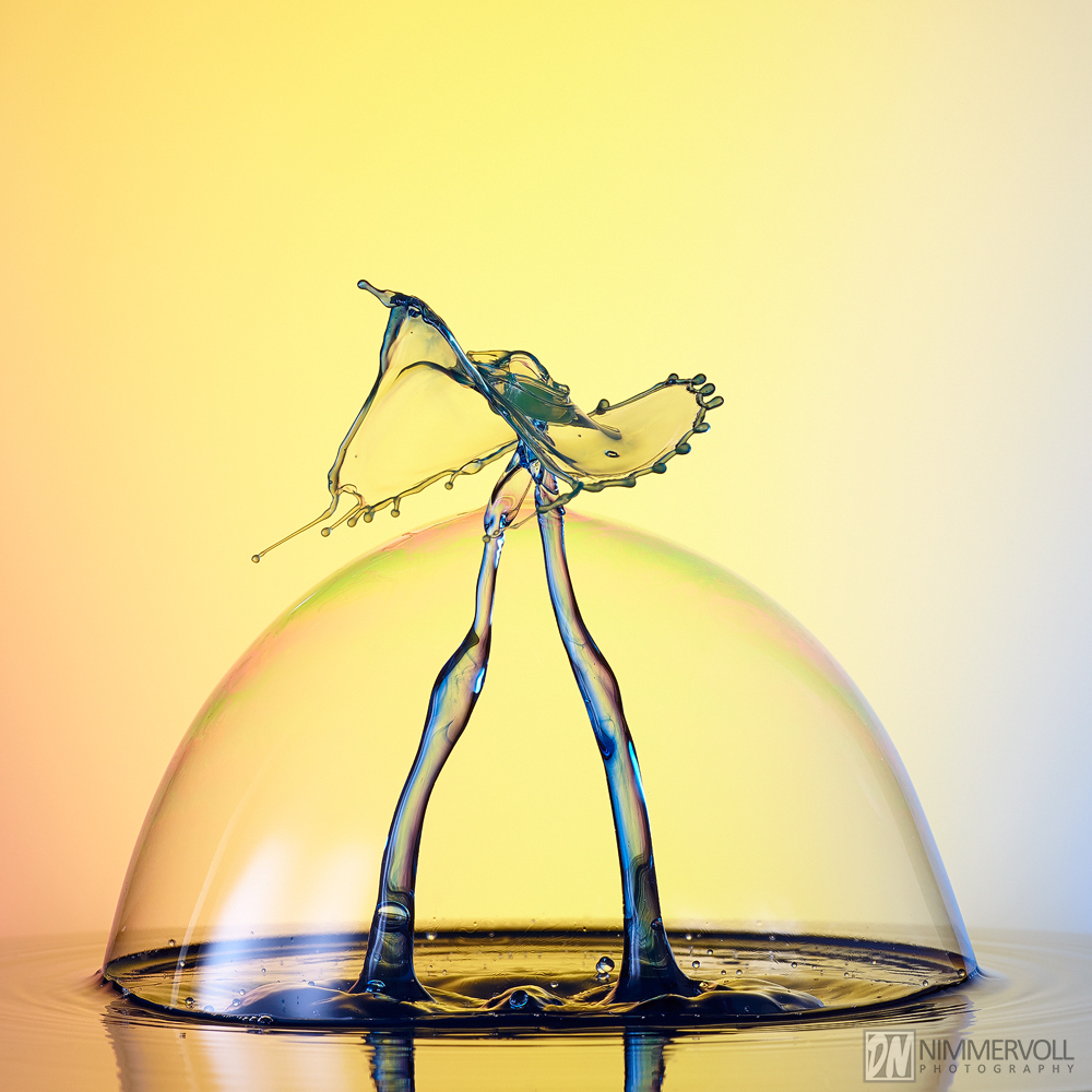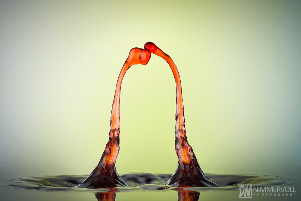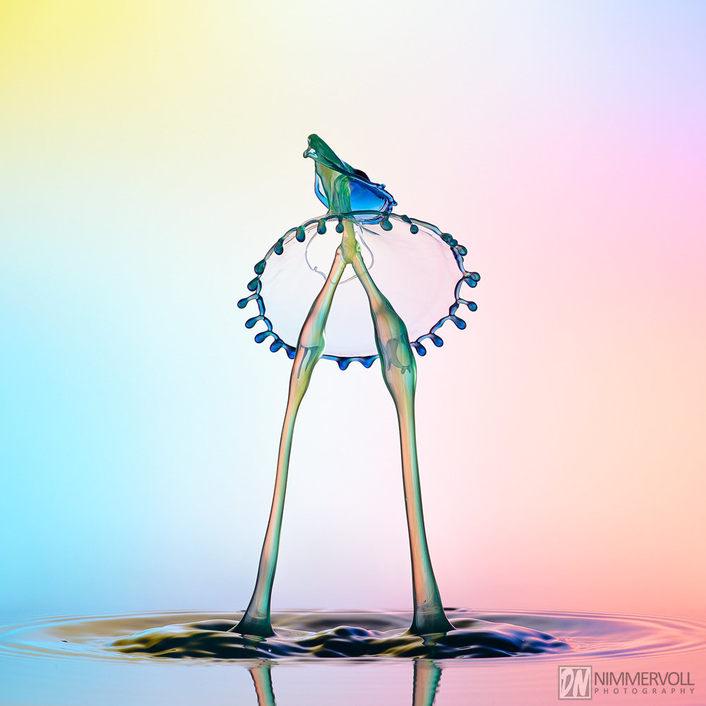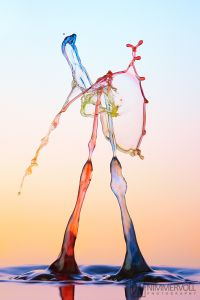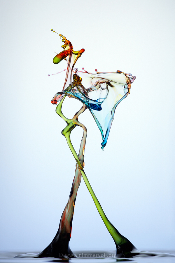Übersetzt heißt das Doppelsäule. Es handelt sich also bei dieser Tropfenvariation um die sogenannten „Zweifüßer“. Diese Formen entstehen indem zwei Tropfen neben einander auf das Wasser auftreffen. Die dabei entstehenden Säulen ziehen sich gegenseitig an und treffen sich am höchsten Punkt um sich zu einer Säule zu verbinden. Mit etwas Glück, kann man dann auf diese Säule noch einen weiteren Tropfen landen um ein Schirmchen zu erzeugen.