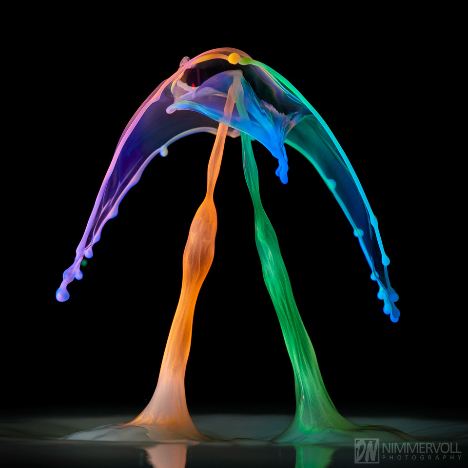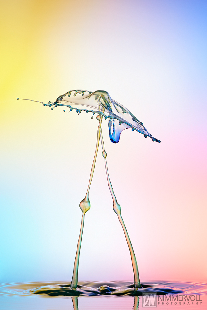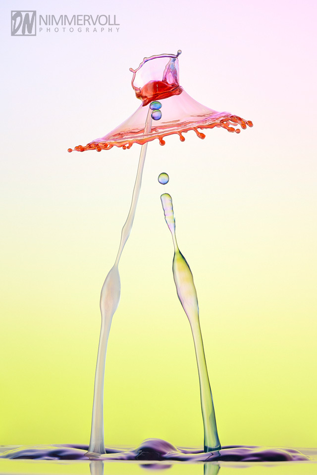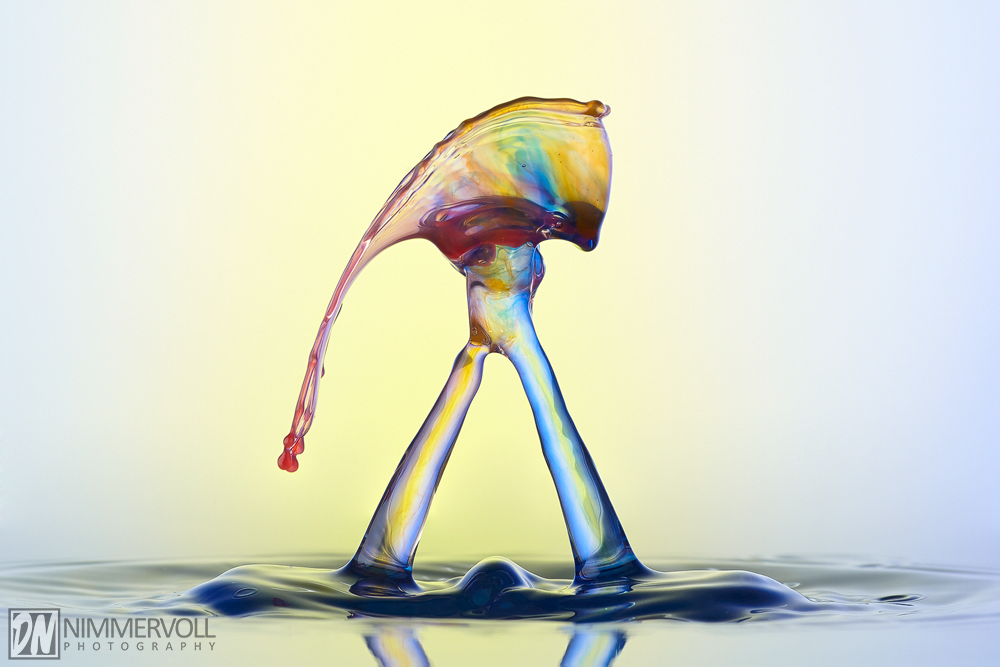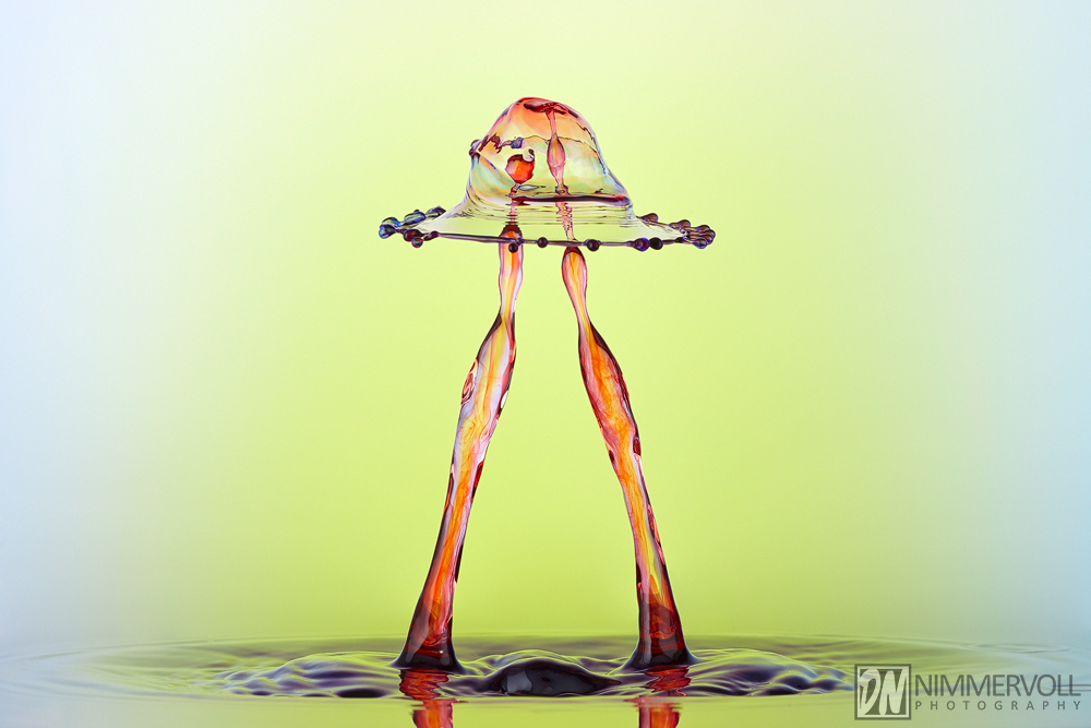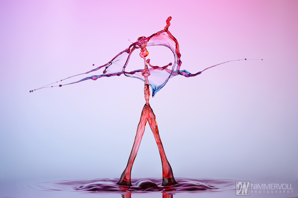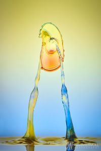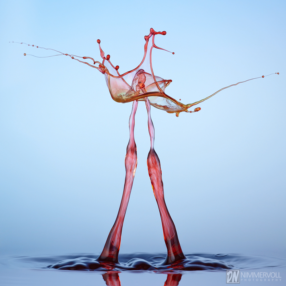 Übersetzt heißt das Doppelsäule. Es handelt sich also bei dieser Tropfenvariation um die sogenannten „Zweifüßer“. Diese Formen entstehen indem zwei Tropfen neben einander auf das Wasser auftreffen. Die dabei entstehenden Säulen ziehen sich gegenseitig an und treffen sich am höchsten Punkt um sich zu einer Säule zu verbinden. Mit etwas Glück, kann man dann auf diese Säule noch einen weiteren Tropfen landen um ein Schirmchen zu erzeugen.