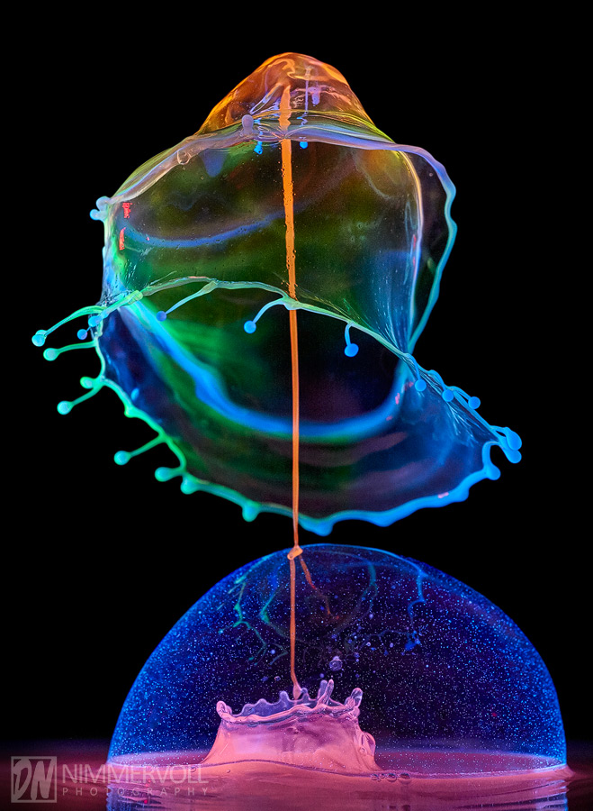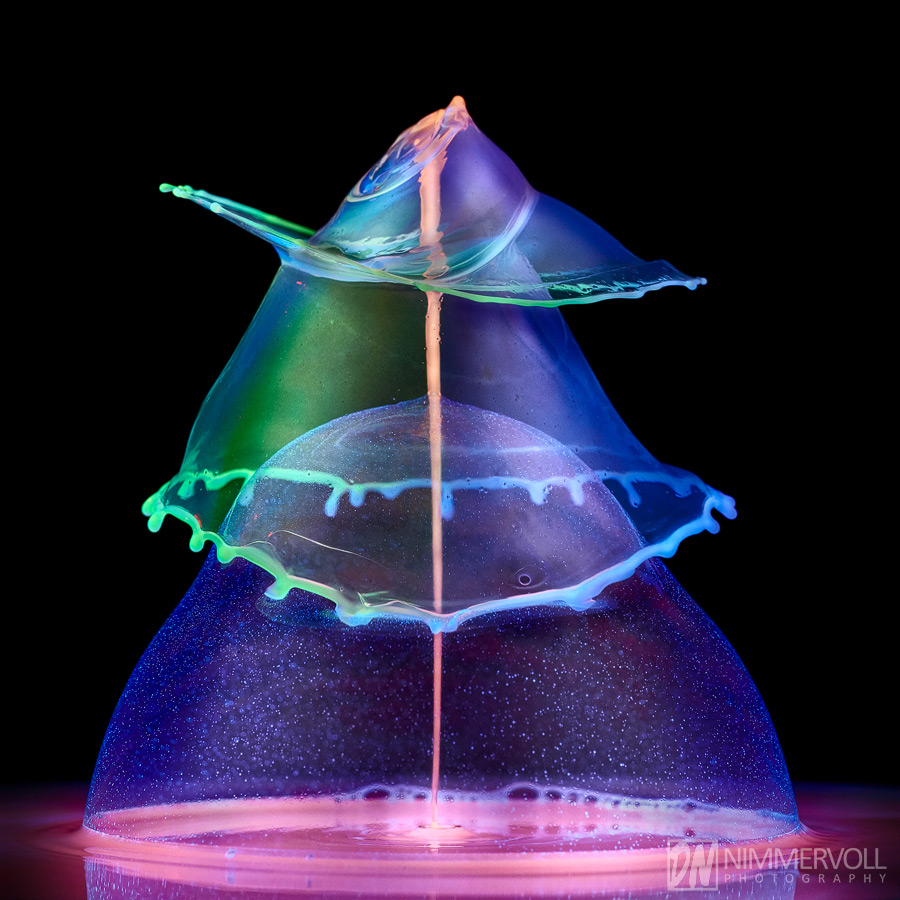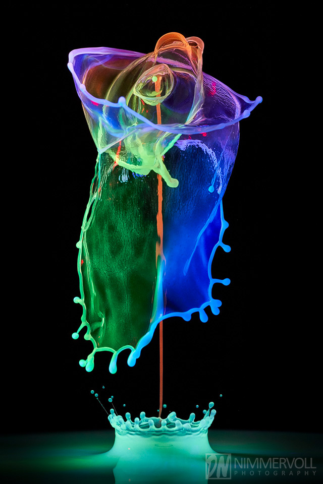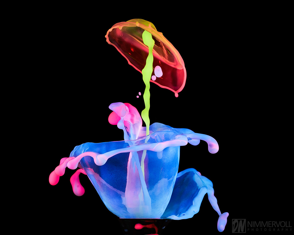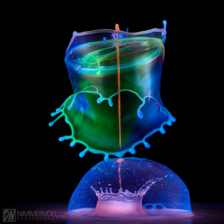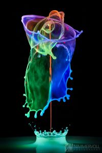 Diese Bilder entstehen mit Hilfe von einem speziellen UV-Blitz wie er normalerweise in der Dokumentation der Kriminalistik, aber auch in der Beweisführung z.B. bei Ausweisdokumenten, zum Einsatz kommt. Verwendet man dafür spezielle fluoreszierende Farben, beginnen die Wasserskulpturen zu leuchten. Fantastische Bilder mit kräftigen Farben sind die Ergebnisse. Weitere Infos dazu findest Du in meinem Blog: CLICK