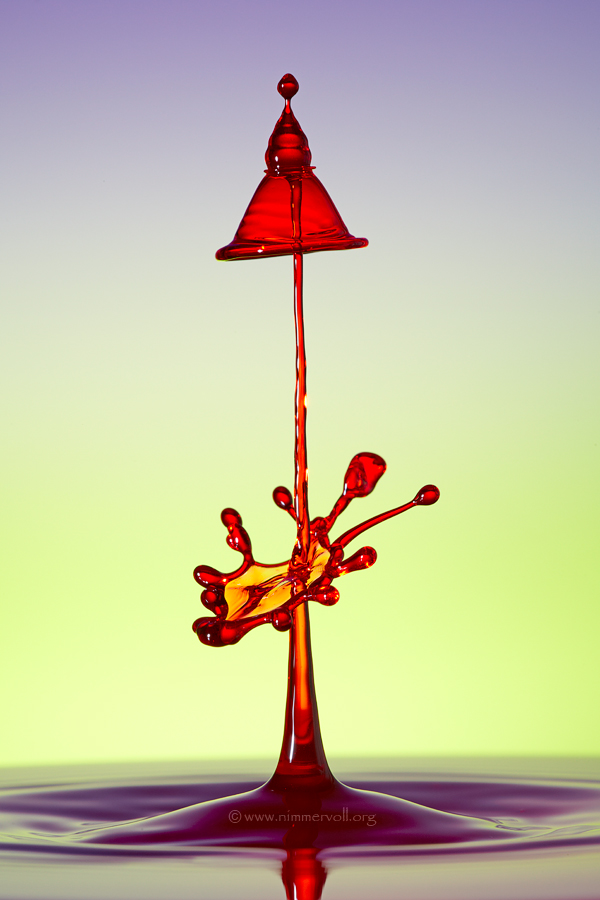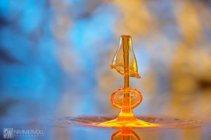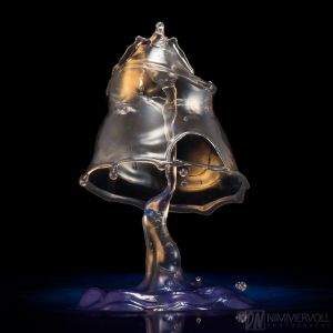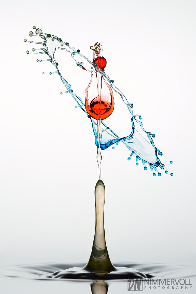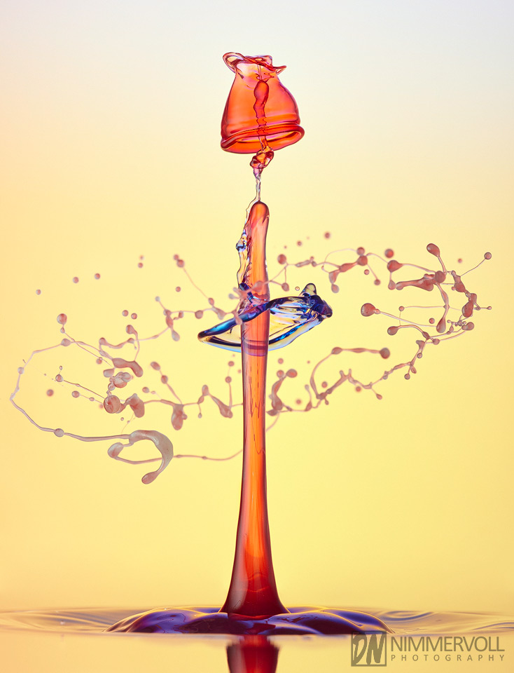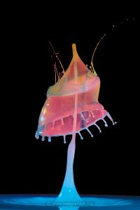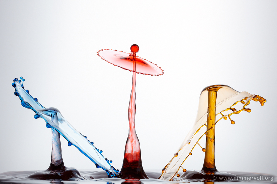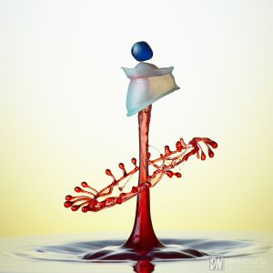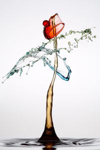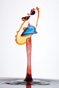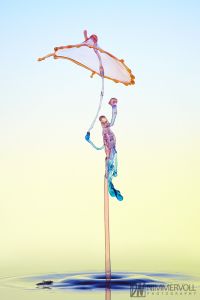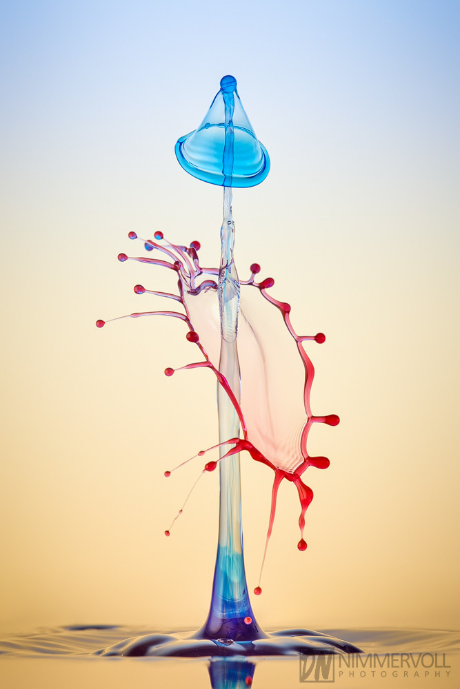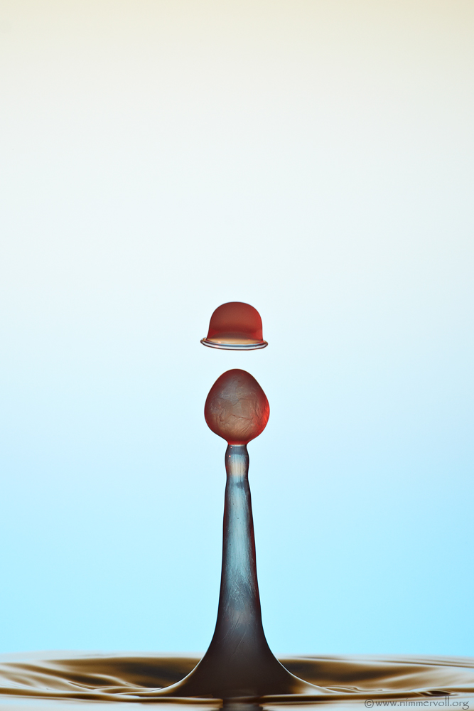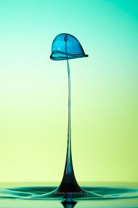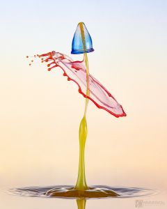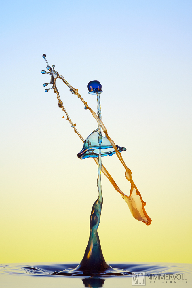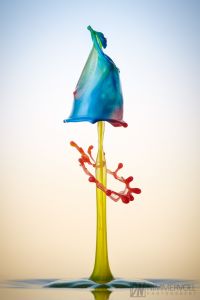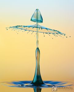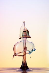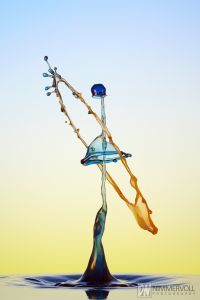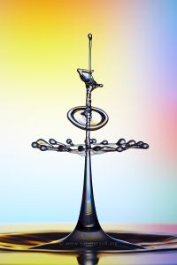 Fallen zwei Tropfen in der richtigen Größe und im passenden Abstand zu einander auf eine Wasseroberfläche, können die dadurch entstehenden Säulen bis zu 20 cm hoch springen. Durch diese Technik ergeben sich viele unterschiedliche Wasserskulpturen.