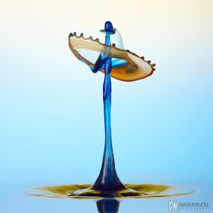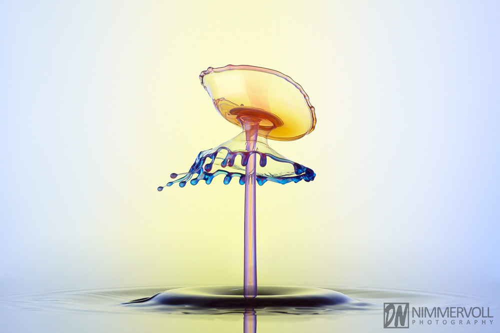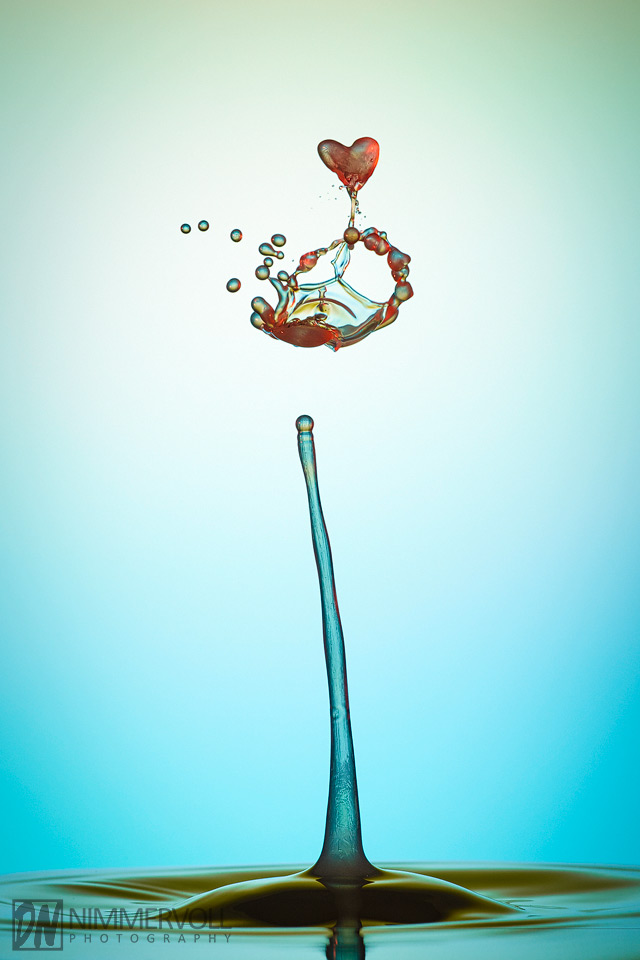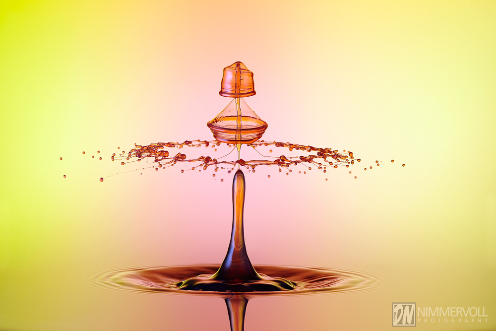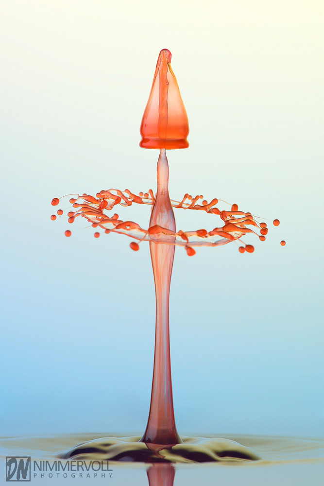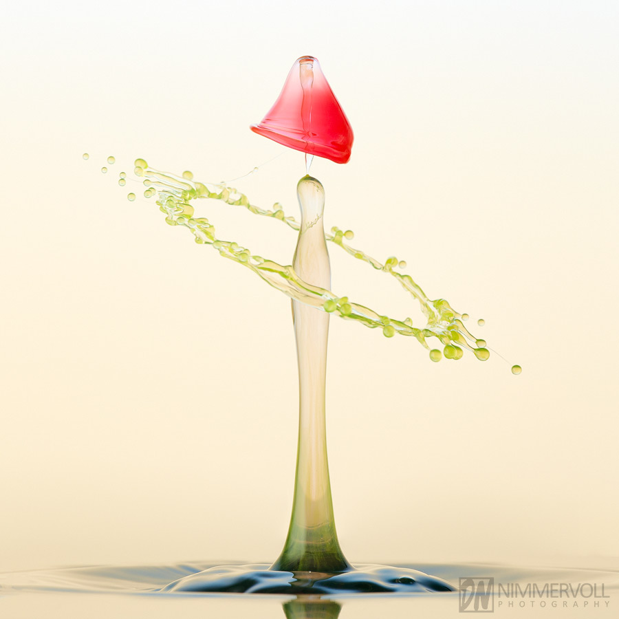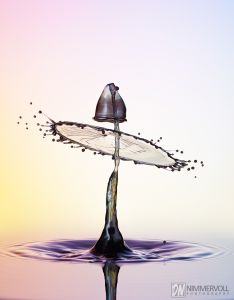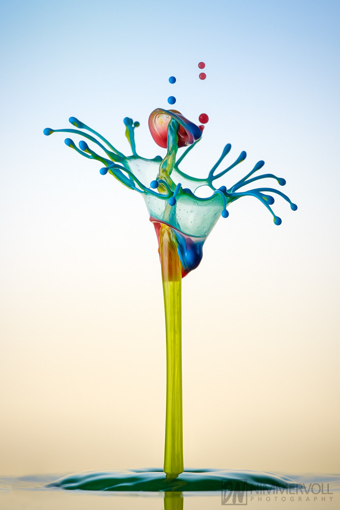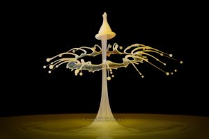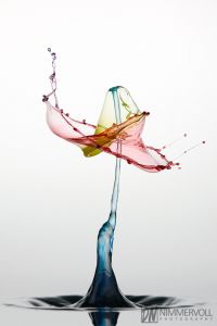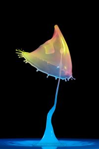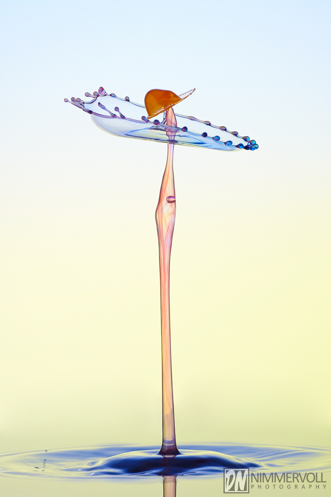 Fallen zwei Tropfen in der richtigen Größe und im passenden Abstand zu einander auf eine Wasseroberfläche, können die dadurch entstehenden Säulen bis zu 20 cm hoch springen. Durch diese Technik ergeben sich viele unterschiedliche Wasserskulpturen.