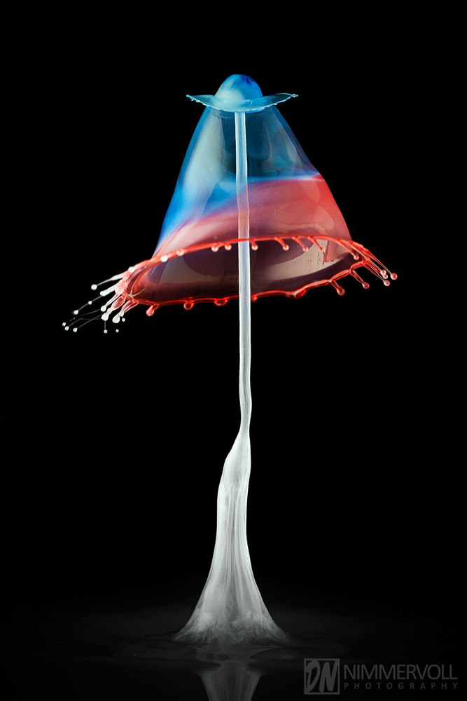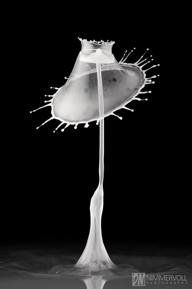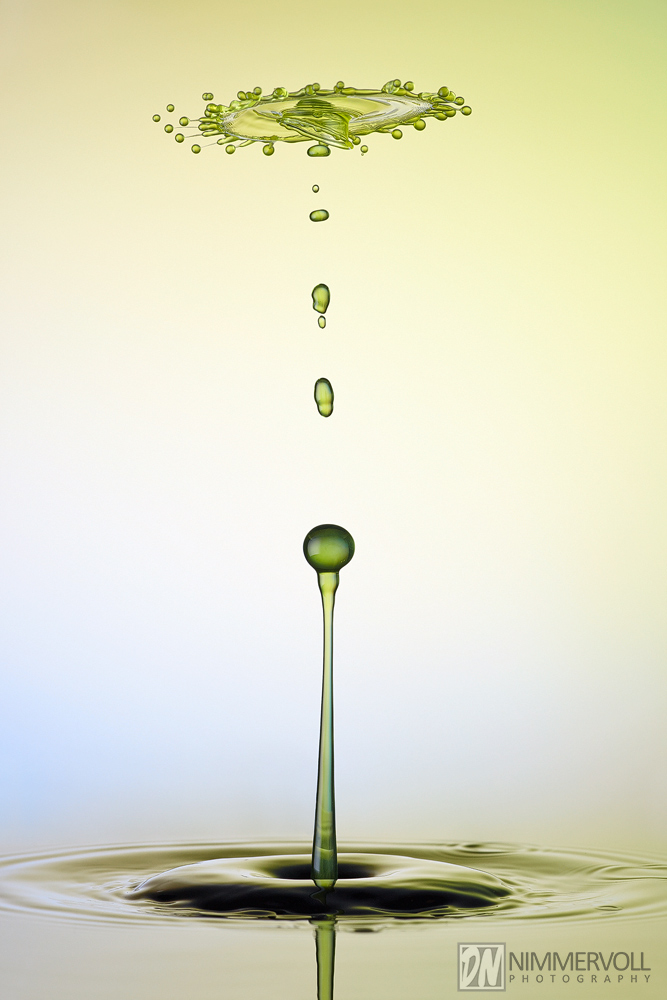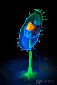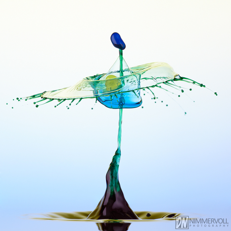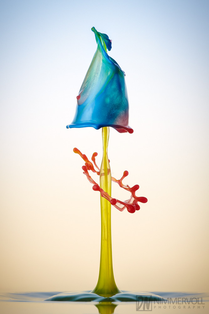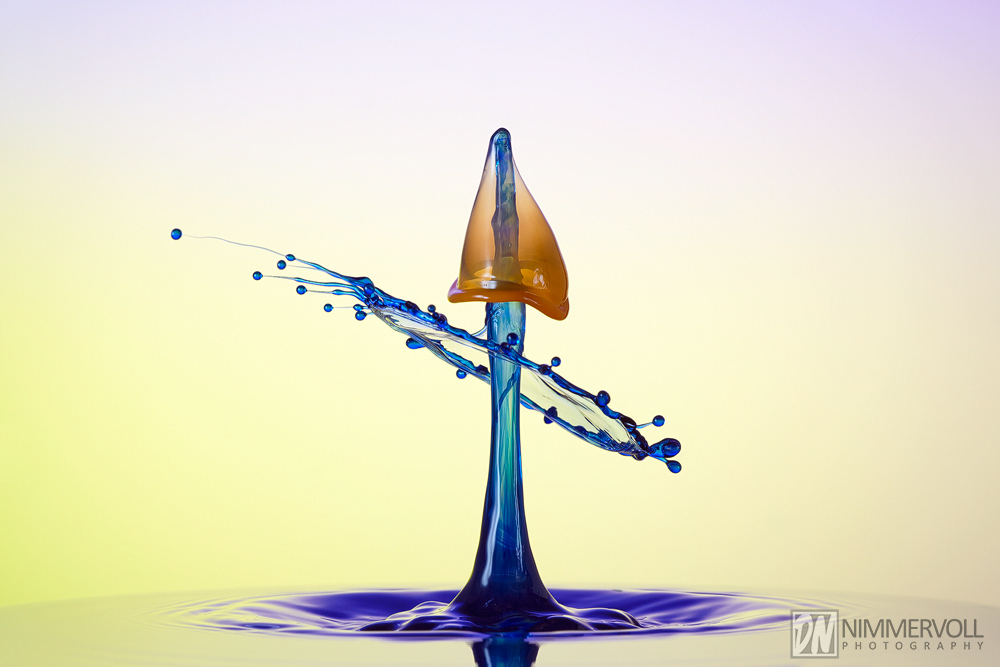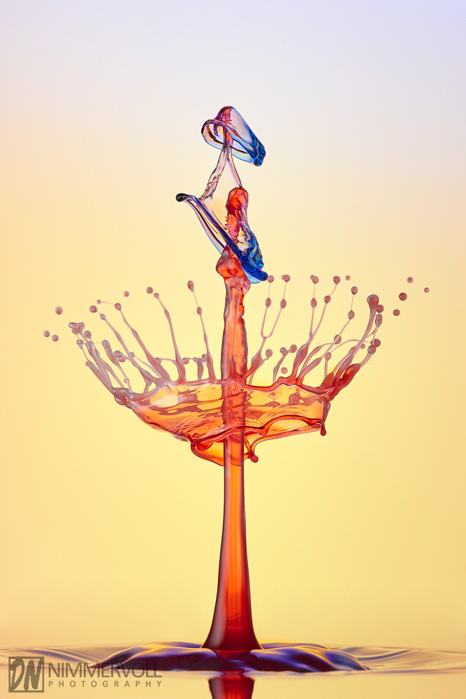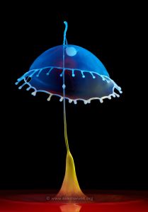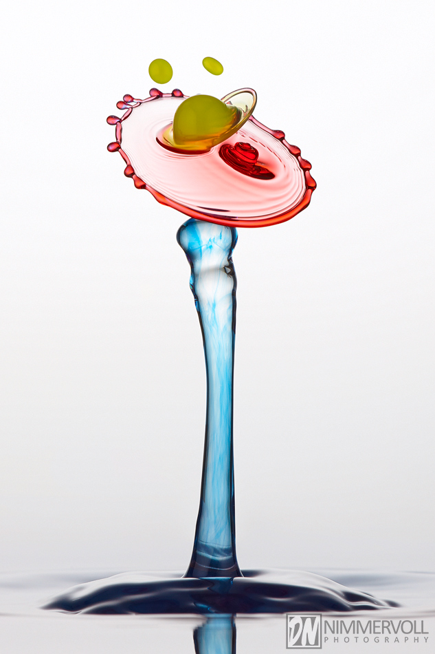 Fallen zwei Tropfen in der richtigen Größe und im passenden Abstand zu einander auf eine Wasseroberfläche, können die dadurch entstehenden Säulen bis zu 20 cm hoch springen. Durch diese Technik ergeben sich viele unterschiedliche Wasserskulpturen.