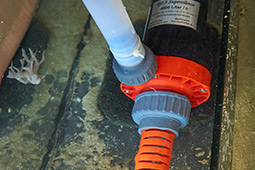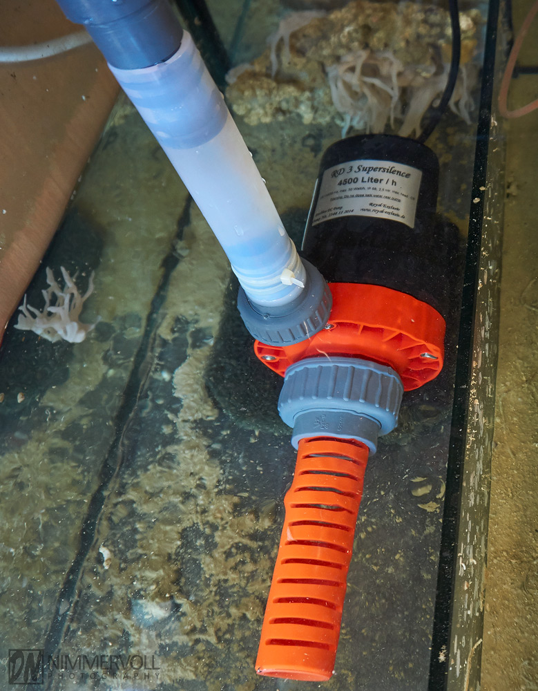 Im letzten Abteil steht dann eine Rückförderpumpe. Eine Royal Exklusiv RD3 fördert das Wasser über ein 32 mm PVC Rohr wieder zurück in das Aquarium. Über ein T-Stück hängt außerdem noch ein 25 Watt DeBary UV-Entkeimer dran.