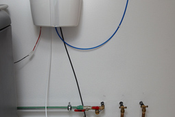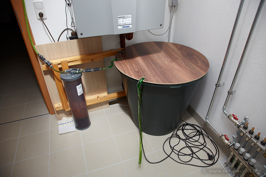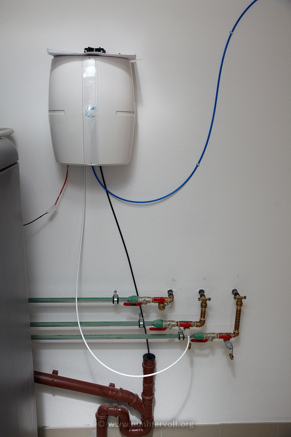 Im Keller habe ich mir eine Osmose Anlage mit einer 210 Liter Regentonne aufgebaut. Damit habe ich genug Wasser um einen Teilwasserwechsel durch zu führen. In einer 10 Liter Filtersäule habe ich nach der Osmose noch ein Mischbettharz nachgeschaltet um auch noch das restliche Silikat aus dem Trinkwasser zu entfernen. Das so gewonnene Wasser hat eine Leitfähigkeit von 0-1 µS.