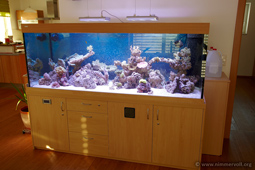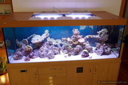 um einen Sonnenaufgang und Sonnenuntergang bzw. Wolkeneffekte simulieren zu können. Weiters habe ich mir noch zwei GHL Mitras über das Becken gehängt. Mit der Mitras lässt sich durch 9 dimmbare LED's mit jeweils unterschiedlichen Farben das komplette Farbspektrum individuell bestimmen und so einen natürlichen Tagesverlauf simulieren. Für die Nacht steht außerdem noch ein 29,5 Tage Phasen Mond zur Verfügung.