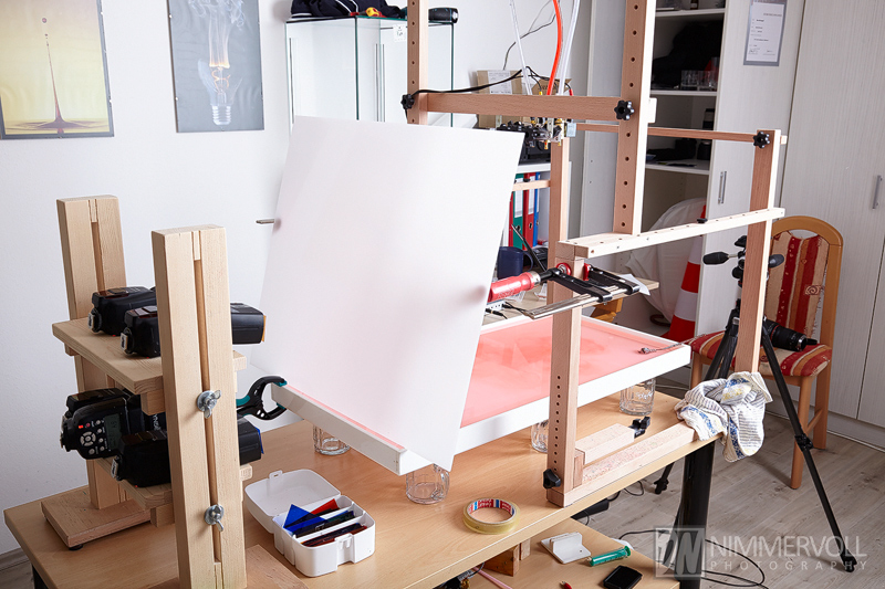 • Ausrüstung: Kamera und Objektiv, Steuergeräte, Magnetventile und Düsen, Wasserbecken, Selbstbau-Holzgestell