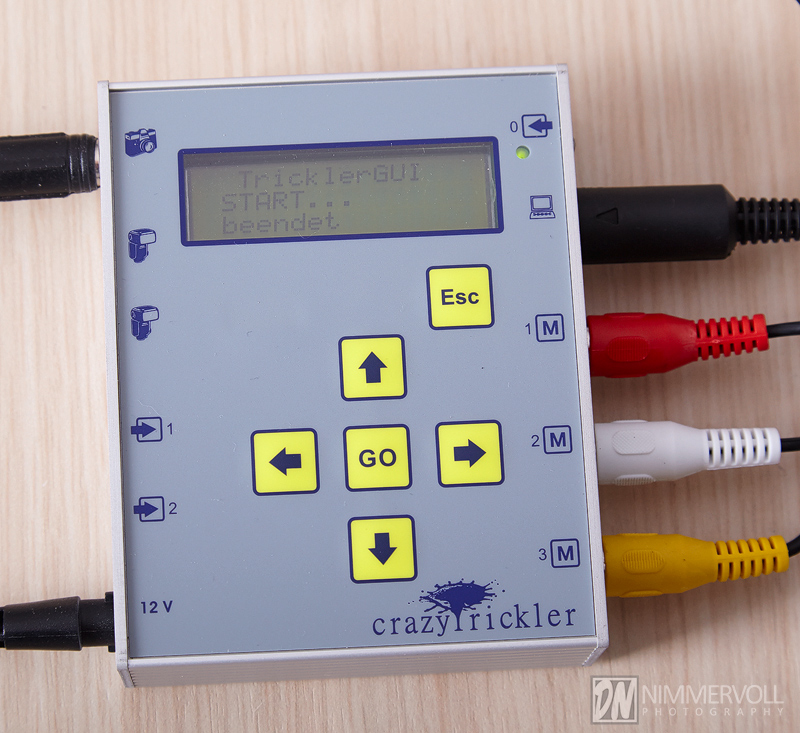 Der CrazyTrickler ist das preiswerteste der drei Geräte. Er hat 3 Ausgänge für die Magnetventile. Der große Vorteil gegenüber dem StopShot ist, dass man hier keinen Ausgang durch die Kamera oder einen Blitz belegen muss. Der CrazyTrickler hat für Kamera und Blitze jeweils eigene Ausgänge. Dadurch kann man immer bis zu 3 Ventile ansteuern. Zudem kann der CrazyTrickler übersichtlich am Laptop bedient werden, was beim StopShot ebenfalls nicht möglich ist.